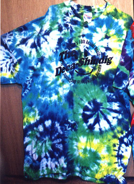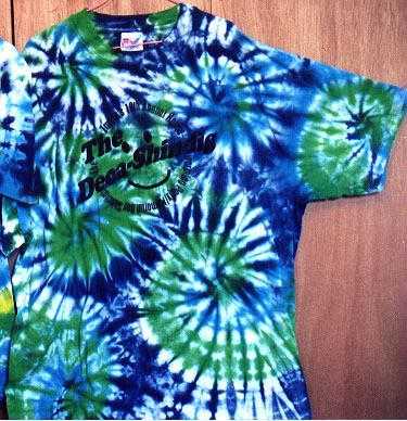 Soak and wring out fabric. Lay out shirt face down on a flat surface. Pinch where you want the center of each spiral and spin. Work with one spiral at a time by spinning one a few turns, then another, then another. Return to previous sections to spin more if you want. The result will be a flat, thick, weird shaped slab with bulges out the sides (on left in picture at right). Rubberband across slab so that all spirals are contained. Dye pie-shaped wedges of each spiral in whatever pattern you choose. Each color used on each pinched section will result in a spiral of that color.